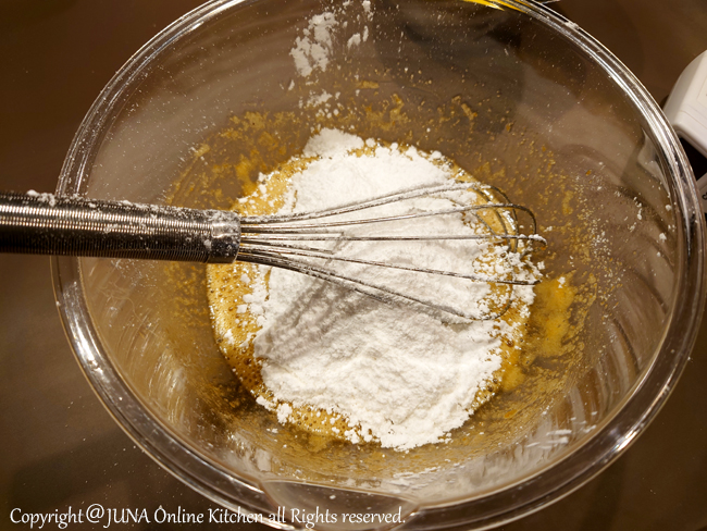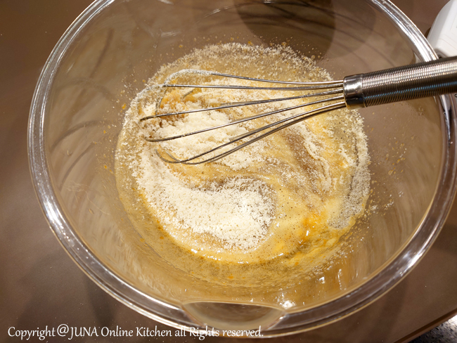 4.3にアーモンドパウダーを入れてグルグルと混ぜ合せ、さらに準備の米粉とベーキングパウダーを入れて、泡立器でなじむまでグルグルと混ぜ合わせる。