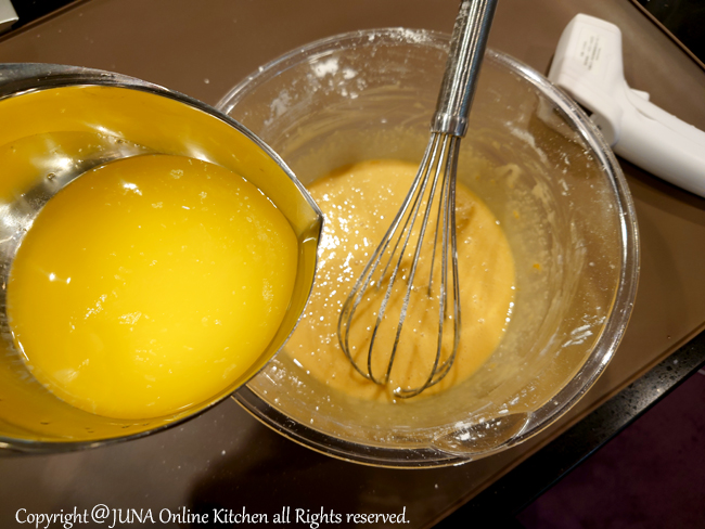 ※湯せんにかけてあったバターを一度取り出し、お湯の温度を少し上げて(70℃ほどにする)ボウルを浸けます。