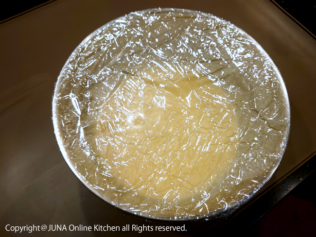 6.ボウルにラップを密着させ(または絞り袋に入れ)、冷蔵庫で一晩(最低3時間以上)寝かせる。