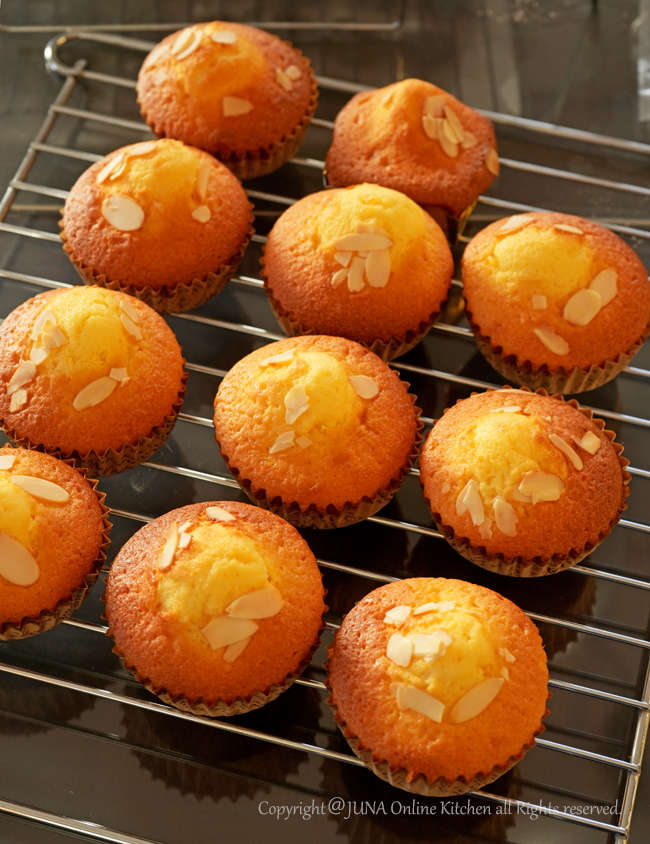 9.温度を180℃に下げ、12〜15分焼く。中央がぷっくり盛り上がり、周りに綺麗な焼き色がつけばOK。カップのものは網に取って冷まし、型で焼いたものは外して粗熱を取る。