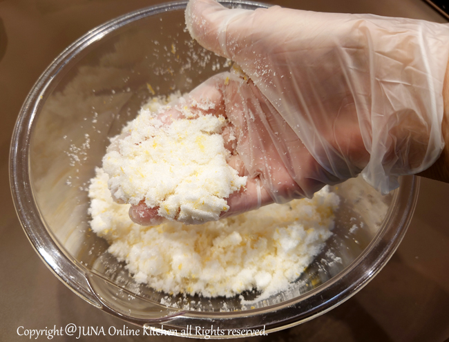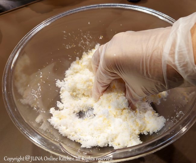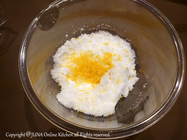 上白糖におろしたレモンの皮を擦り付けるように混ぜると、レモンの油胞(香りの成分を含んでいます)が潰れて香りが砂糖によく移り、焼き上がりの風味が格段によくなります。