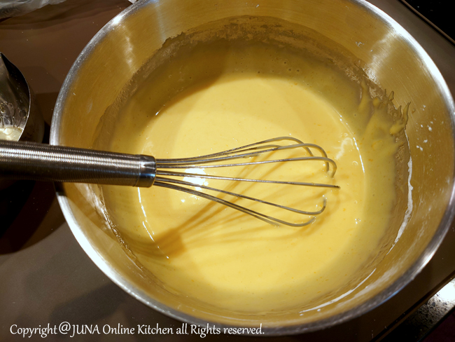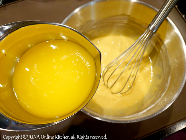 5.4に50〜60℃に保った溶かしバターを加え、生地にツヤが出るまでさらにグルグルと混ぜ合わせる。