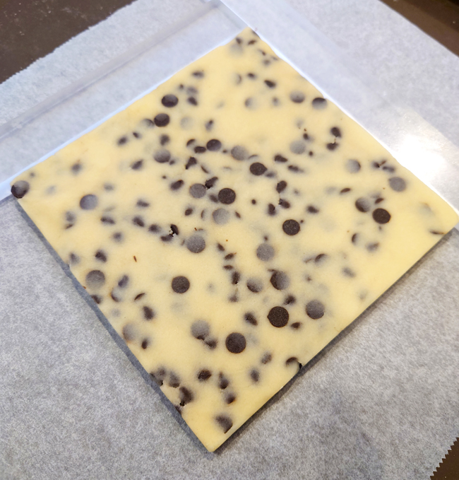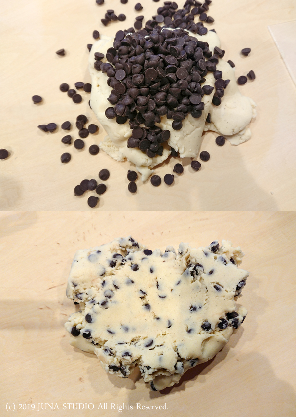 4.生地を再びカードで集め、チョコチップをおいてカードで生地を折りたたみながら混ぜ込んでいく。まとまったらラップに包み、冷凍庫で10分ほど生地を休ませる。