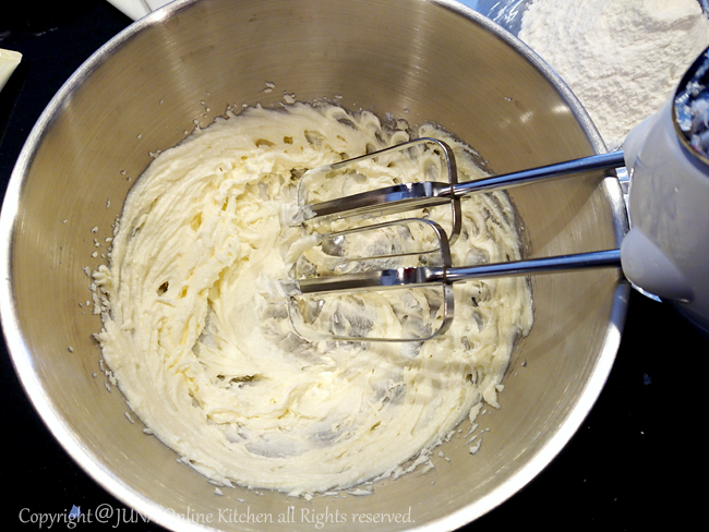 家庭でも作りやすいようにクッキーのようにバターを攪拌する手順で作ります。