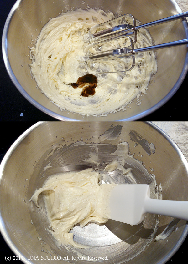 2.バニラビーンズやオイルを入れる場合は加え、再びハンドミキサーで混ぜ合わせる。一体化したらミキサーの羽根についた生地をきれいに落とし、