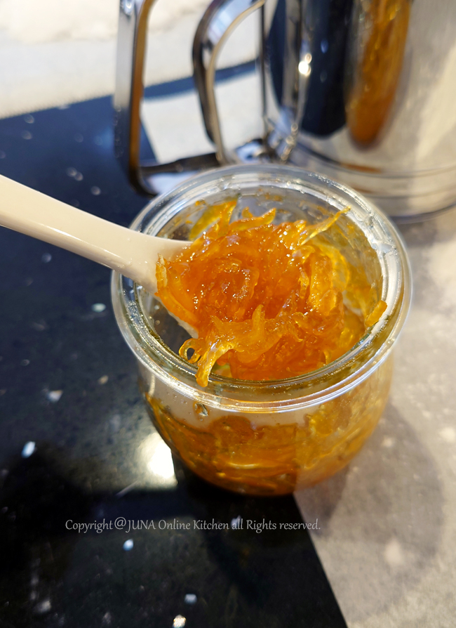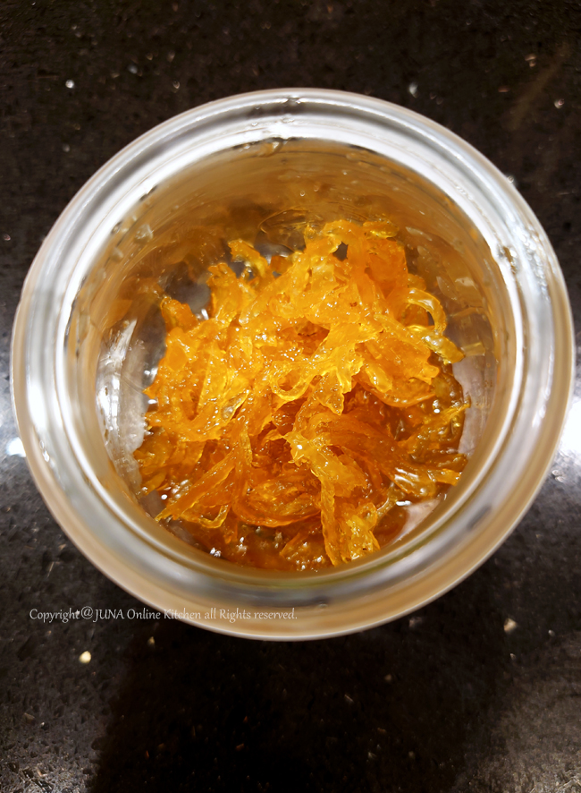 1.ゆず3~4個分の皮を白い部分は付けずにむき、千切りにして2回ほど下ゆでする。茹でる時間は各5~10分ほど(細い千切りなら5分ほどでOK)。