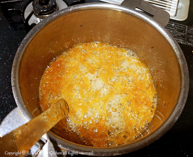 2.小鍋に1、かぶるほどの水、皮の重量の半量~8割ほどの砂糖(好みに合わせる)、はちみつ大さじ1~2を加え、水分が1~2割ほどになるまで煮詰める。