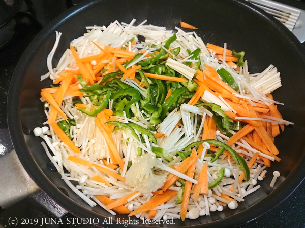 1.えのきは食べやすい長さに切り、ピーマンは縦半分に切ってから繊維をたつ方向で細切りにする。にんじんはえのきと同じ長さの細切りにする。