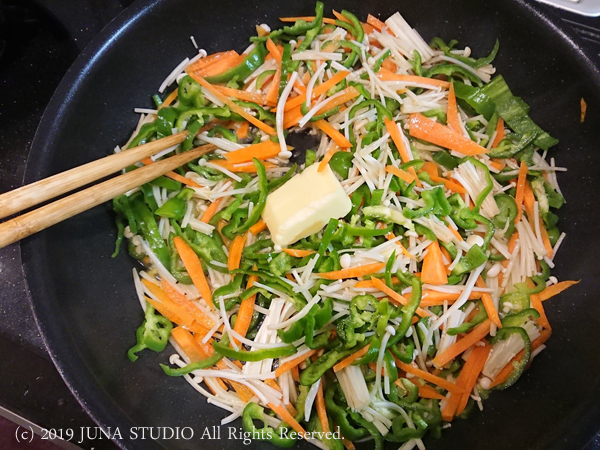 3.野菜に油がなじんだら【A】を加えてさらに炒め、バターが溶けたら仕上げに黒コショウをかける。器に盛る。