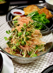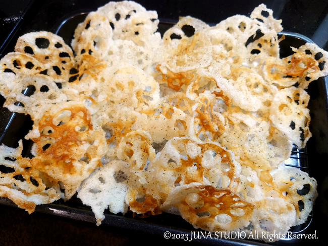 1.れんこんを薄切りにして水にしばらくさらし、ざるにあげて水気をきる。