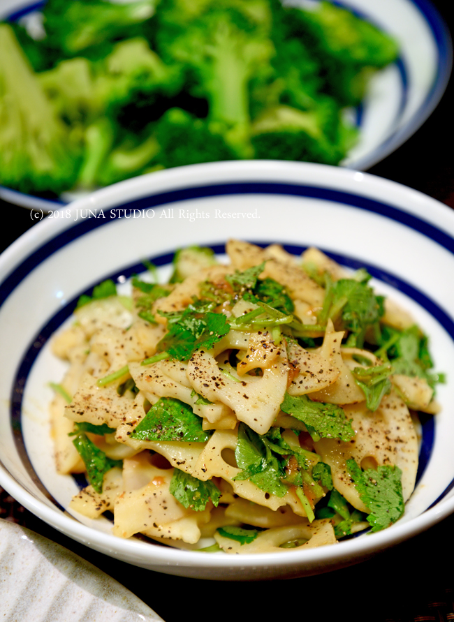 れんこんを三つ葉と梅で和える簡単副菜です。